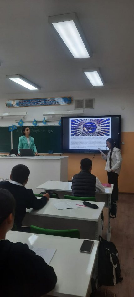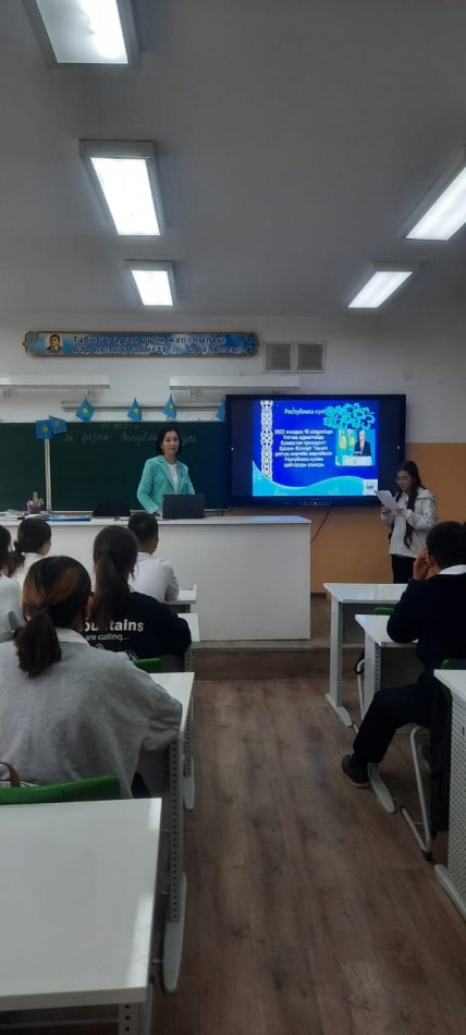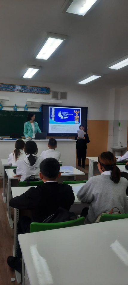 Шымкент қаласы білім басқармасына қарасты №131 жалпы орта білім беретін мектебінде бүгін, 2022 жылдың 23 қазан күні мектеп директоры Жарасова Гүлжан Спандиярқызының басшылығымен және тәрбие жоспарына сәйкес, 25 қазан Республика күніне орай бірыңғай сынып сағаттары өтілді.