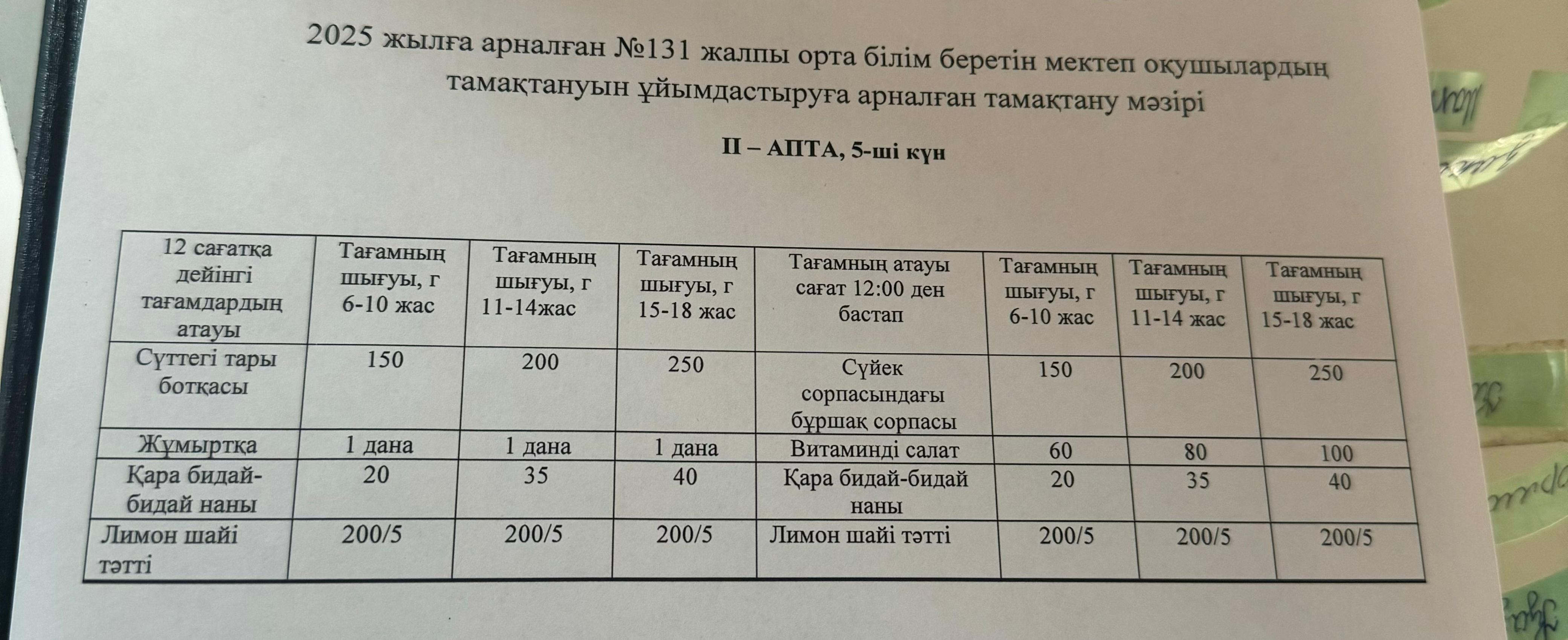 14 февраль 2025 0 Асхана айдары Шымкент қаласы білім басқармасына қарасты N131 жалпы орта білім беретін мектебінде міндетті білім беру қорынан бір реттік тамақ ішетін оқушыларға берілетін 2025 жылдың 14 ақпаны күнгі ас мәзірін назарларыңызға ұсынамыз.