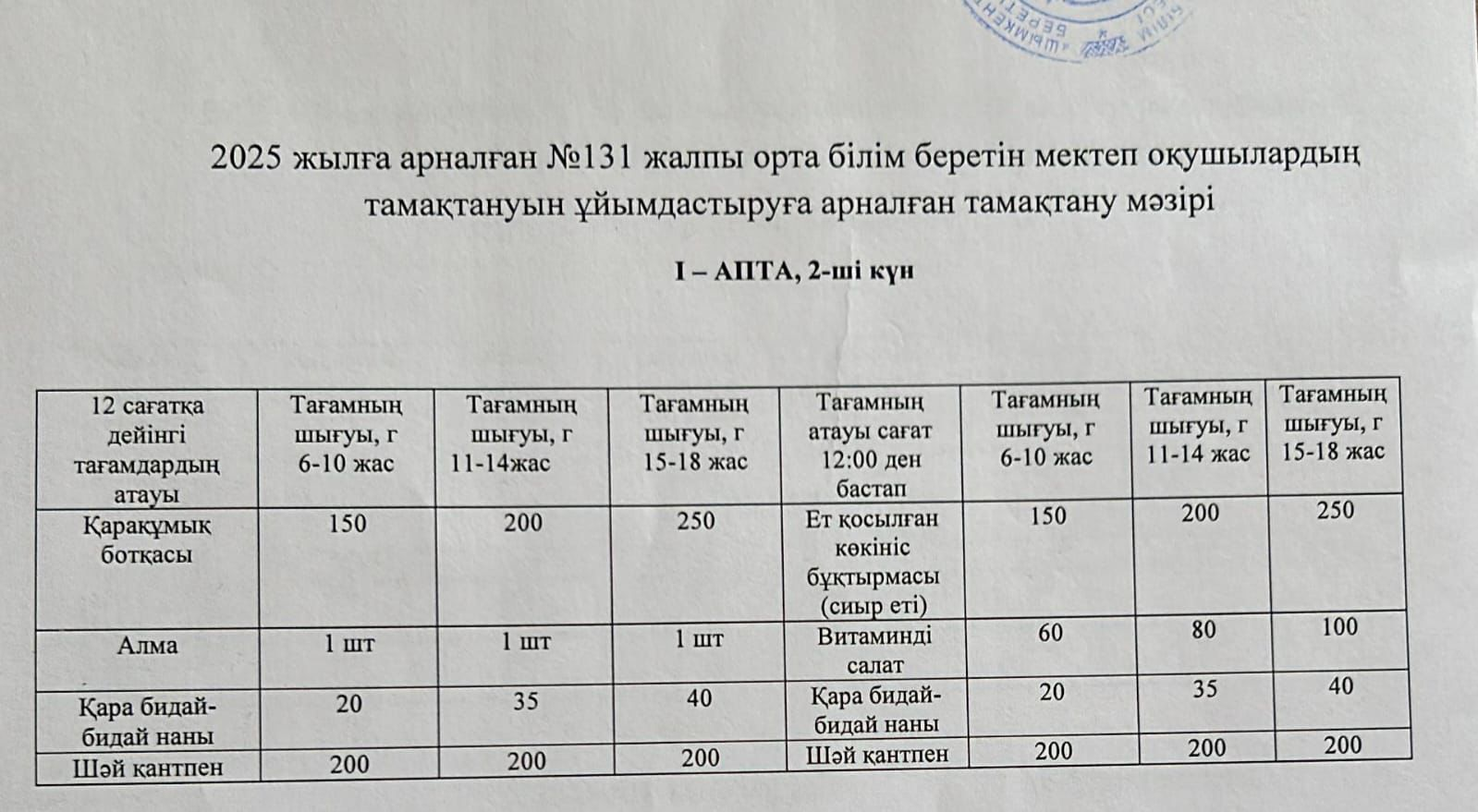 18 март 2025 0 Асхана айдары Шымкент қаласы білім басқармасына қарасты N131 жалпы орта білім беретін мектебінде міндетті білім беру қорынан бір реттік тамақ ішетін оқушыларға берілетін 2025 жылдың 18 наурызы күнгі ас мәзірін назарларыңызға ұсынамыз.