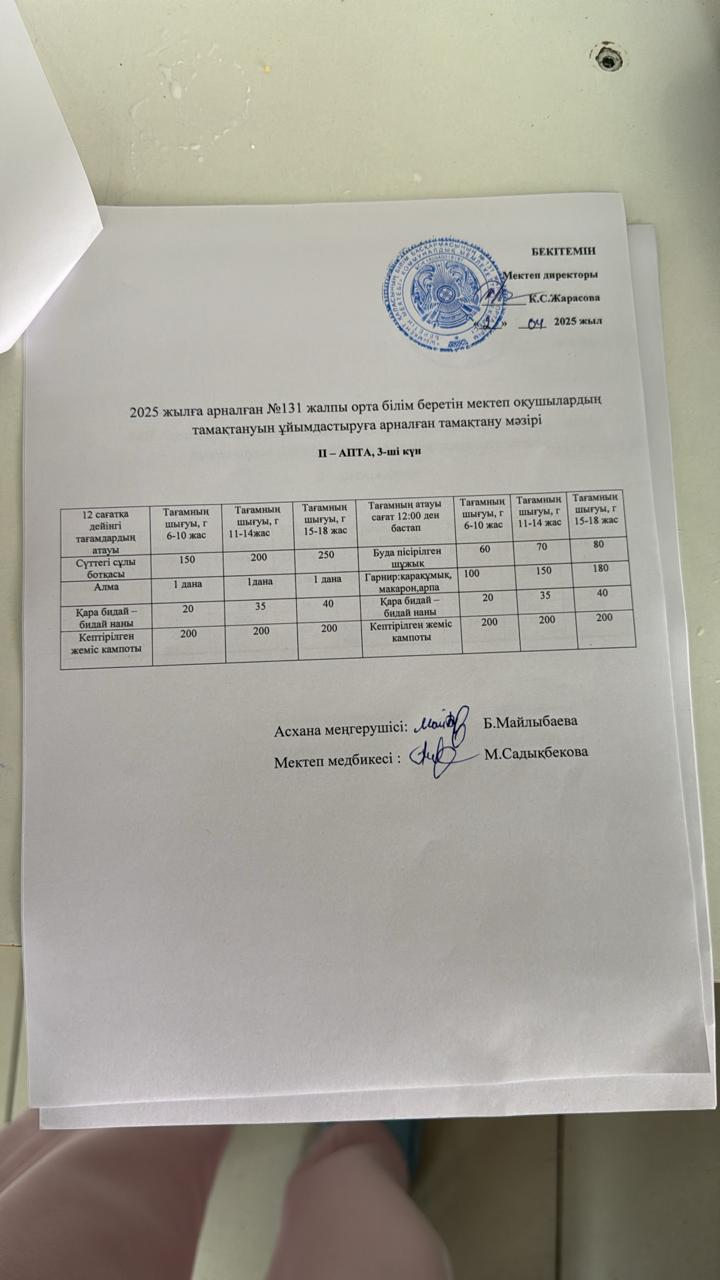 02 апрель 2025 0 Асхана айдары Шымкент қаласы білім басқармасына қарасты N131 жалпы орта білім беретін мектебінде міндетті білім беру қорынан бір реттік тамақ ішетін оқушыларға берілетін 2025 жылдың 02 сәуірі күнгі ас мәзірін назарларыңызға ұсынамыз.
