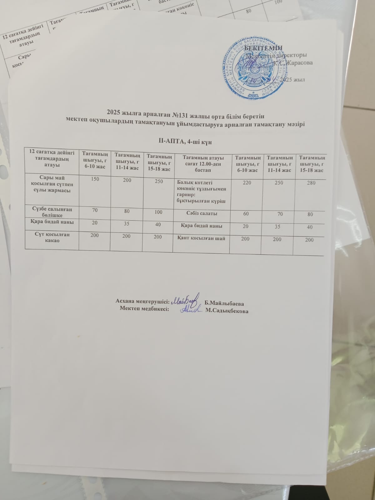 11 апрель 2025 0 Асхана айдары Шымкент қаласы білім басқармасына қарасты N131 жалпы орта білім беретін мектебінде міндетті білім беру қорынан бір реттік тамақ ішетін оқушыларға берілетін 2025 жылдың 10 сәуірі күнгі ас мәзірін назарларыңызға ұсынамыз.