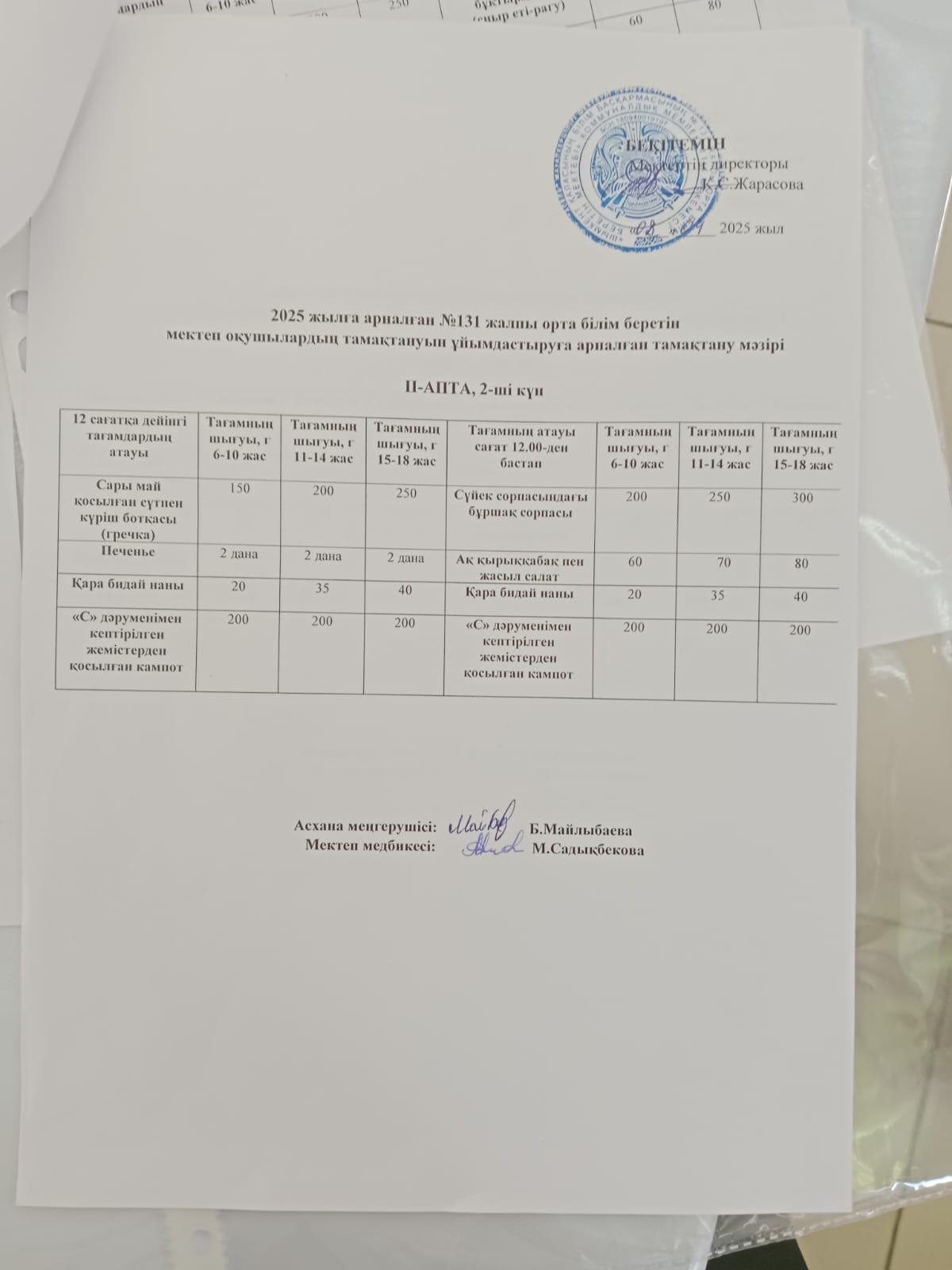 11 апрель 2025 0 Асхана айдары Шымкент қаласы білім басқармасына қарасты N131 жалпы орта білім беретін мектебінде міндетті білім беру қорынан бір реттік тамақ ішетін оқушыларға берілетін 2025 жылдың 08 сәуірі күнгі ас мәзірін назарларыңызға ұсынамыз.
