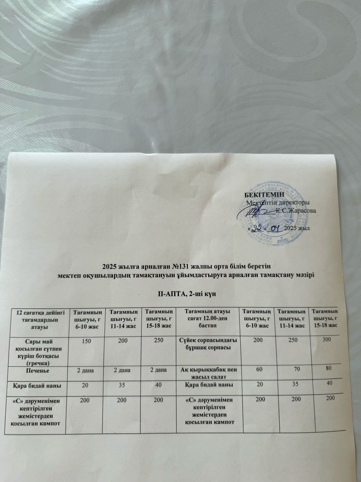 22 апрель 2025 0 Асхана айдары Шымкент қаласы білім басқармасына қарасты N131 жалпы орта білім беретін мектебінде міндетті білім беру қорынан бір реттік тамақ ішетін оқушыларға берілетін 2025 жылдың 22 сәуірі күнгі ас мәзірін назарларыңызға ұсынамыз.