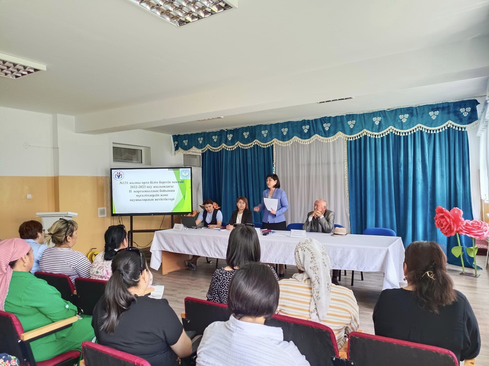 Шымкент қаласы білім басқармасына қарасты N131 жалпы орта білім беретін мектебінің 2022-2023 оқу жылының қорытындысы бойынша мектеп директоры Жарасова Гүлжан Спандиярқызының басшылығымен 2023 жылдың 23 мамыр күні Қамқоршылық кеңес және жалпы ата-аналар төрайымдарымен жиналыс өткізілді.